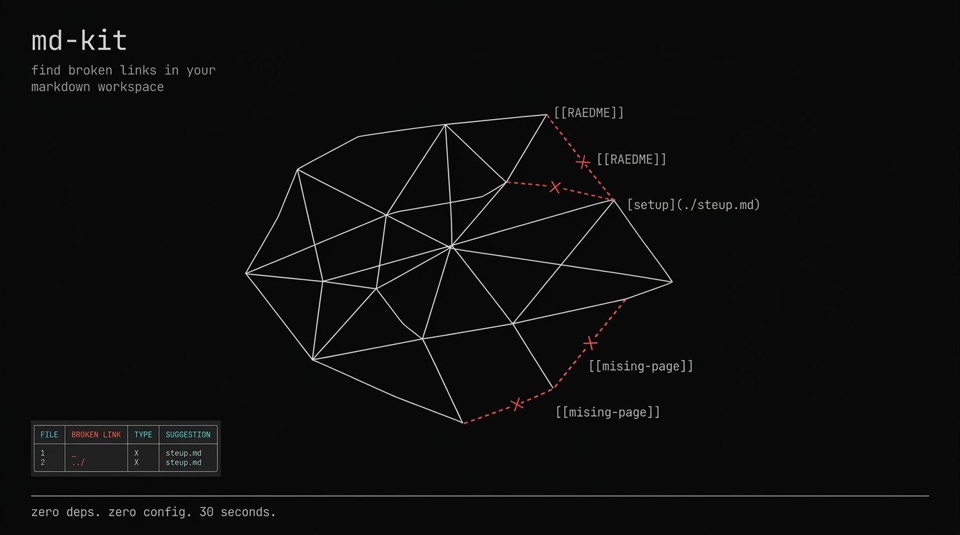 markdown workspace toolkit — find broken links, auto-fix them, move files with link updates, and run event-driven pipelines.