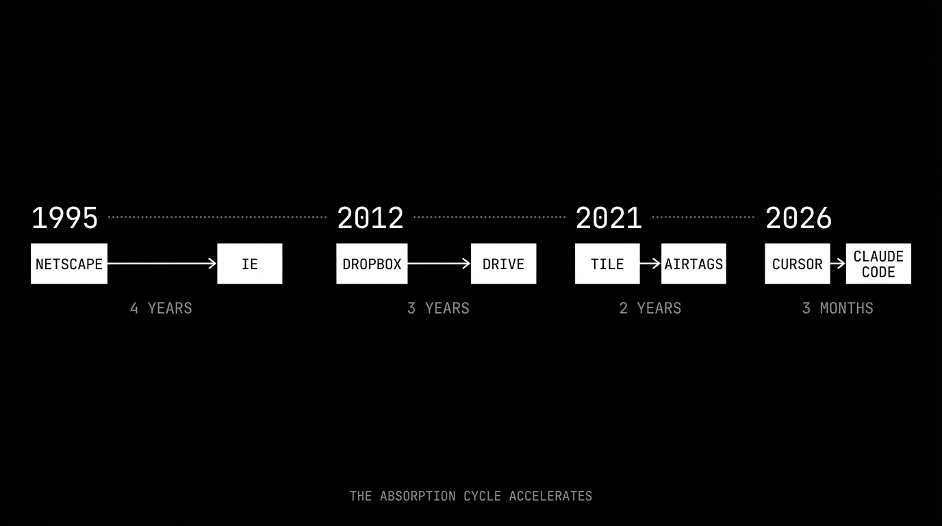 microsoft did it to netscape. the browser was the most important application of the early internet, and microsoft shipped internet explorer bundled with windows. it took four years. google did it to dropbox. cloud storage was the killer app for file management, and google shipped drive integrated into every google account. three years. apple did it to tile. location tracking was a proven consumer category, and apple shipped airtags with the find my network built in. two years.