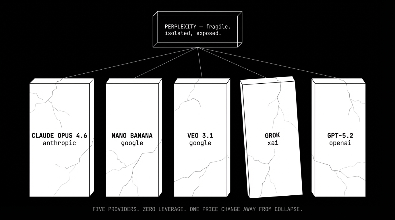 this looks like smart engineering. use the best model for each task. but look at it from the other direction: their product quality is entirely determined by decisions made in five different companies' roadmap meetings — none of which they attend. every model improvement makes perplexity temporarily better. every API pricing change, rate limit adjustment, or terms of service update is an existential threat they cannot predict or prevent.