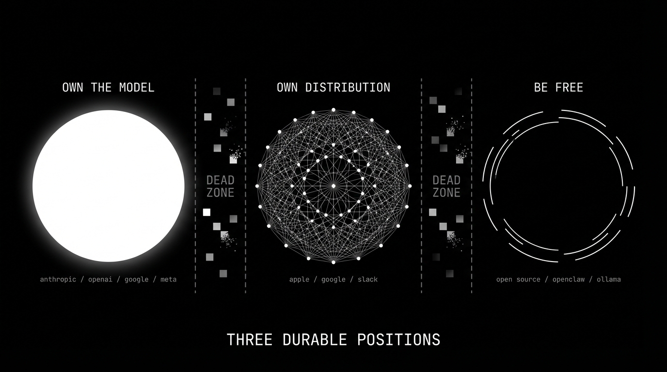 everything in between — every company whose pitch is "we're the best way to use someone else's model" — is in the dead zone. they're not building products. they're building demos for features their providers will ship natively.
