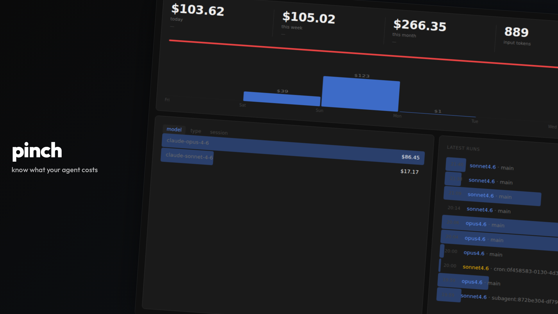ai agents are expensive and invisible. you run a cron, spawn a subagent, iterate on a readme — and somewhere in there you spend $103 before noon. pinch makes that visible.