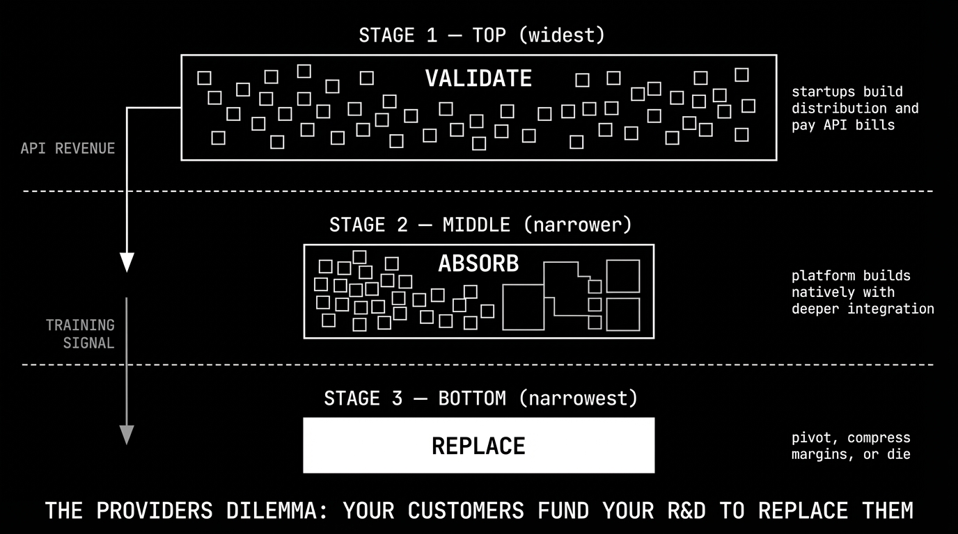 the answer, in both cases, is a company with a shrinking feature advantage, an expensive API bill that funds their competitor's R&D, and a cap table full of investors who priced in a world where the platform layer stayed dumb.